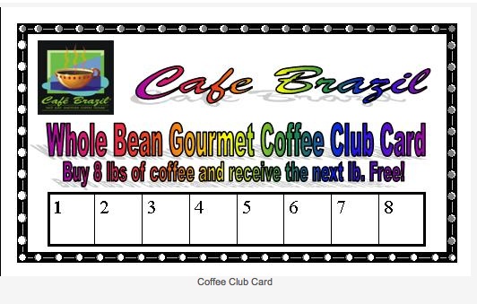 VISIT ANY OF OUR 10 LOCATIONS AND BUY A POUND OF YOUR FAVORITE CAFE BRAZIL BLEND. ASK YOUR SERVER FOR THIS CARD AND START RACKING UP THE PUNCHES TOWARDS EARNING A FREE POUND OF COFFEE!