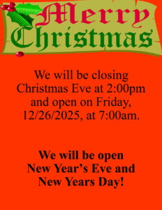 We will close at 2pm Christmas Eve, closed Christmas and all locations open at 7am on Friday. …